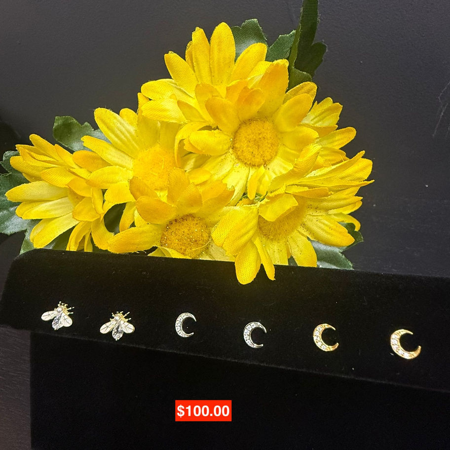 The Crescent Moon & Bee Stud Earrings Set blends celestial charm with modern elegance. This curated multi-pair set features sparkling crescent moon studs alongside delicate bee designs, accented with shimmering crystals for a refined yet playful look.