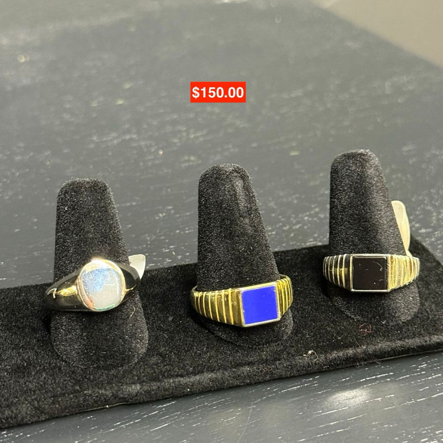 Bold and eye-catching rings featuring smooth stone centers set in gold-tone bands. Each design offers a strong, timeless look that adds character to any outfit. Ideal for those who love classic statement jewelry with a modern edge.